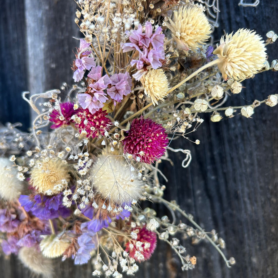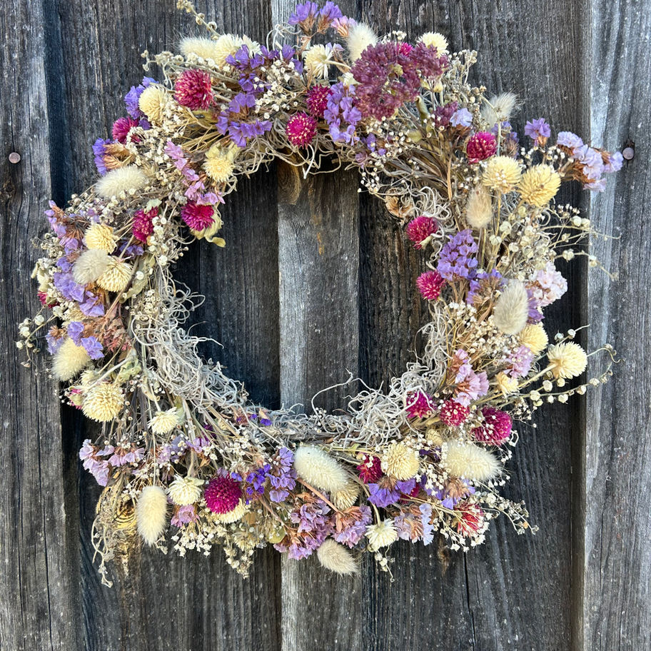Each wreath is crafted from locally grown blooms and greenery, dried naturally to preserve their color and texture. Designed to bring the beauty of the farm into your home year-round, these pieces are full of seasonal character — no two are ever alike. Perfect for doorways, walls, or above the mantle, they offer a touch of nature that lasts long after the growing season ends.